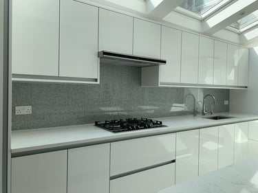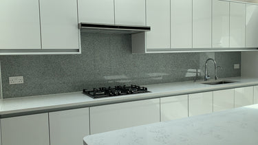 Elevate your space with the 100% Fine Sparkle – Platinum Silver Glass Splashback — where durability meets timeless elegance, and everyday practicality shines with subtle glamour.