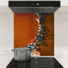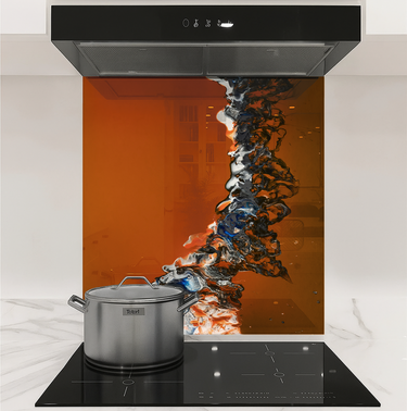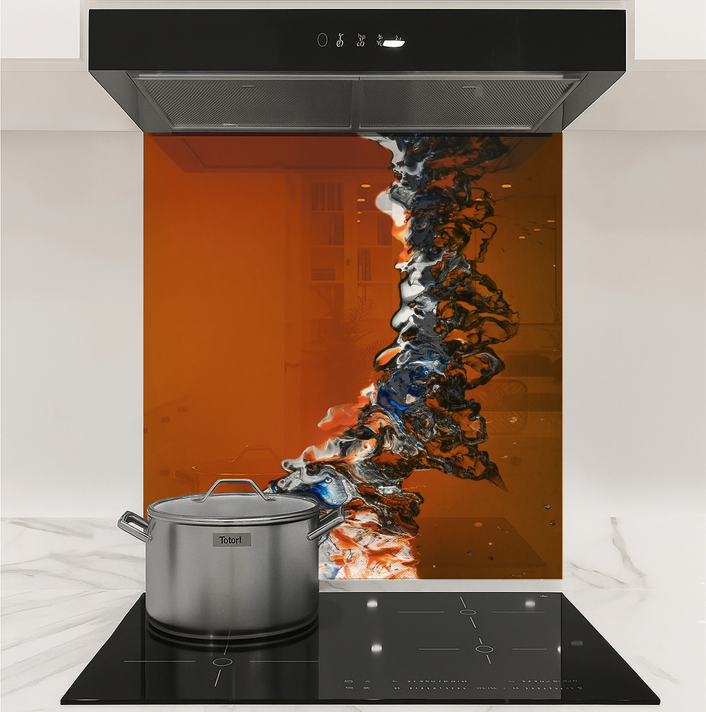Bring striking artistry into your kitchen with this DIY Glass Splashback, featuring a bold design inspired by Ramona Patterson’s creative works. The deep orange background is energized with dynamic black, white, and metallic tones flowing through the center, creating a dramatic statement piece.