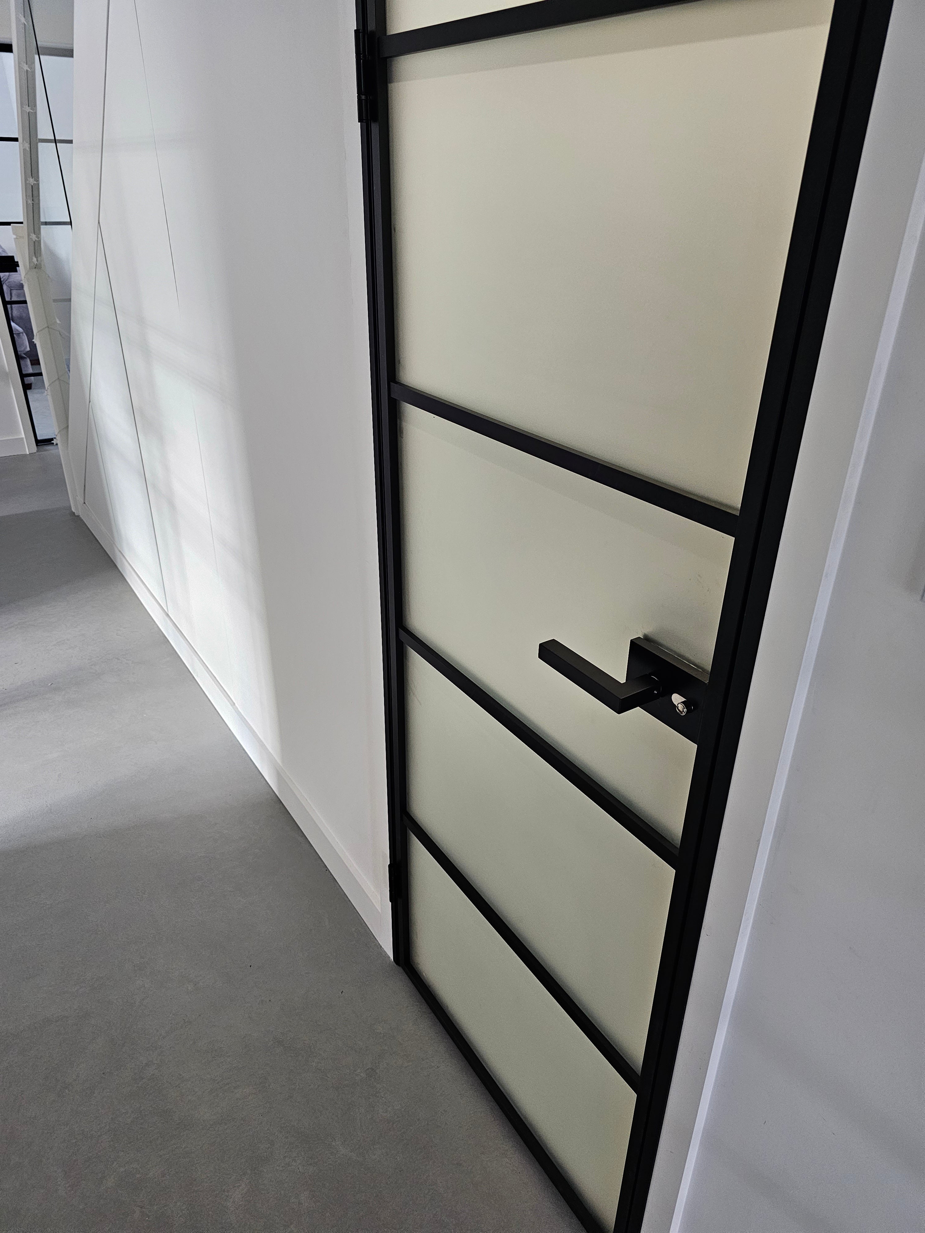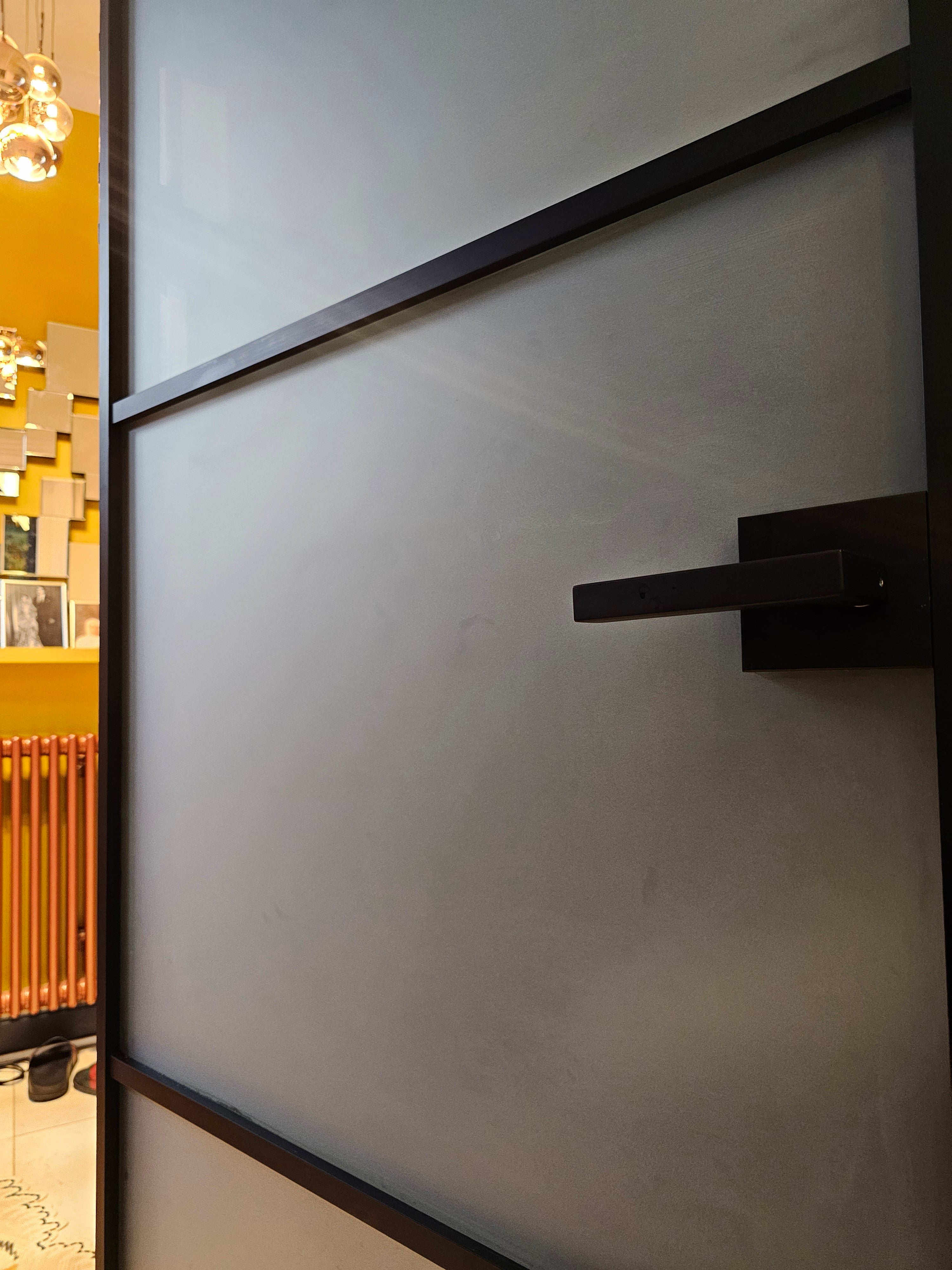 The frosted glass panel softens incoming light, creating an atmosphere of tranquillity and sophistication. This subtle opacity provides just the right level of privacy without sacrificing brightness — perfect for both residential and professional environments seeking a refined aesthetic.
